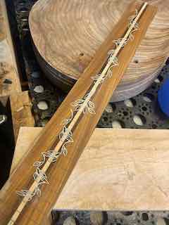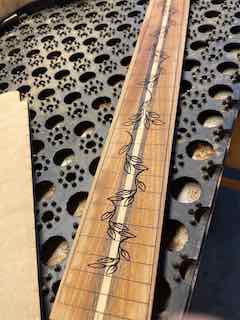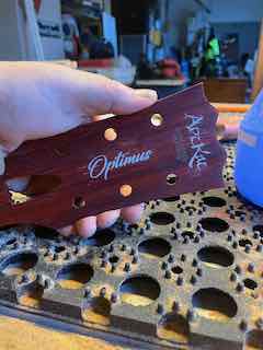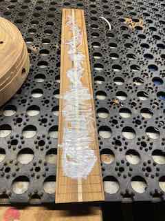 Kaulaan olin jo alumperin päättänyt materiaaliksi vaahteran. Normaalit “kipsonithan” tehdään yleensä niin että body ja kaula on mahonkia ja sit tuo kansi on loimuvaahteraa mut miksi tehdä samanlainen? Hä? Kun kerta vapaat kädet on annettu ja pääsee imrovisoimaan. Kaulamatsku siis “check” mutta otelauta vielä mietitytti. Onneksi pajalta löytyy (luullakseni) Wengeä joka on sinällään hyvinkin kirkassointinen puu. Ainoa ongelma oli että palat mitä sitä oli niin olivat liian kapeita. Ennekin olen niitä yhdistellyt sopivan leveyden saamiseksi mutta nyt halusin vähän (vähä) kikkailla. Joten liimailin pairista Wengestä, mahongista ja koivusta otelaudan jonka sitten tasohöylällä höyläilin sopivaan paksuuteen. Sit pitäähän siihen jotain koristetta saada joten suunnitttelin koristelun jonka sitten poltin laserleikkurilla samalla muodon ja otenauhojen merkkien kanssa. Sen jälkeen sekoitin epoksiin Mica -väriä jonka kuiviuttua aloin hiomaan otelaudan raidusta äpäyt 11″ asteeseen. Se mielestäni onnistui hyvin ja tuli ainakin otelauta jollaista ei heti tule vastaan. Samalla poltin pajanaapuriltani saamaan eksoottiseen puunpalaan lapaan tulevan “kannen” jossa tietysti meirän loko ja asiakkaan niemämä skitta.