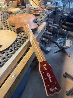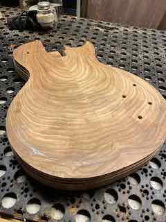 Jo keväällä 2025 tuli tilaus Les Pau -tyypin kitarasta. Itse koin sen vähän jopa pelottavana koska vaikka noita liimakaulaisia on jo tehty niin “Lepassa” on ulkosivuilta kaareva kansi jonka tekemistä sen hetken työkaluilla vähän arvelin.. Mutta kun tilaaja sanoi kysyessäni millaista hän haluaa niin ainoa toivoe oli “kunhan se on punainen” ja heti perään “saat vapaat kädet kaikkeen muuhun”. Se oli helpottavaa koska samaan aikaan oli SG valmisteilla johon oli hyvinkin tarkat speksit miten pitää tehdä ja millainen lopputulos pitäisi olla. Mutta siitä joskus toiste.
